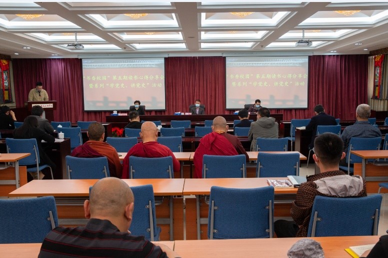 根據《中國藏語系高級佛學院開展黨史學習教育實施方案》安排,2021年4月20日下午,學院舉辦“學黨史、講黨史”暨第五期“書香校園”讀書分享會,共有包括宗教界代表、青年代表、黨員代表、群眾代表在內的8位教職員工圍繞中國共產黨在新民主主義革命時期的歷史交流了學習體會。學院領導張奇、劉鵬、郁紅偉及全體教職員工參加了分享會。