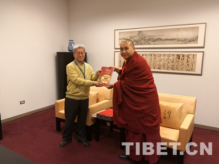 圖為臺北故宮博物院工作人員向中國藏語系高級佛學院副院長、交流團團長郭莽倉活佛贈送紀念品