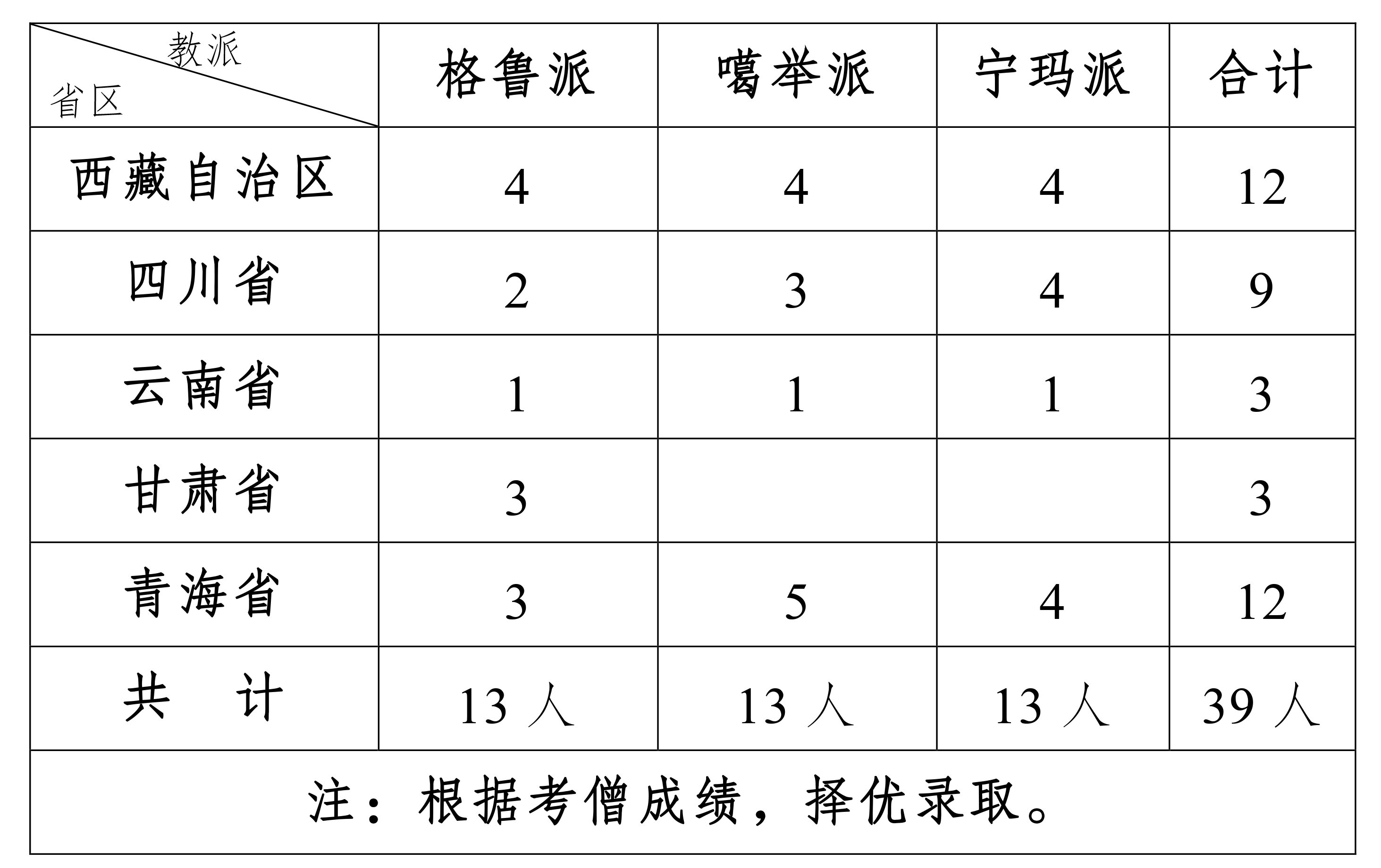 學院計劃招收2024級高級學銜班學員39人,其中格魯派13人,噶舉派13人,寧瑪派13人。各省(區)招生教派及名額如下: